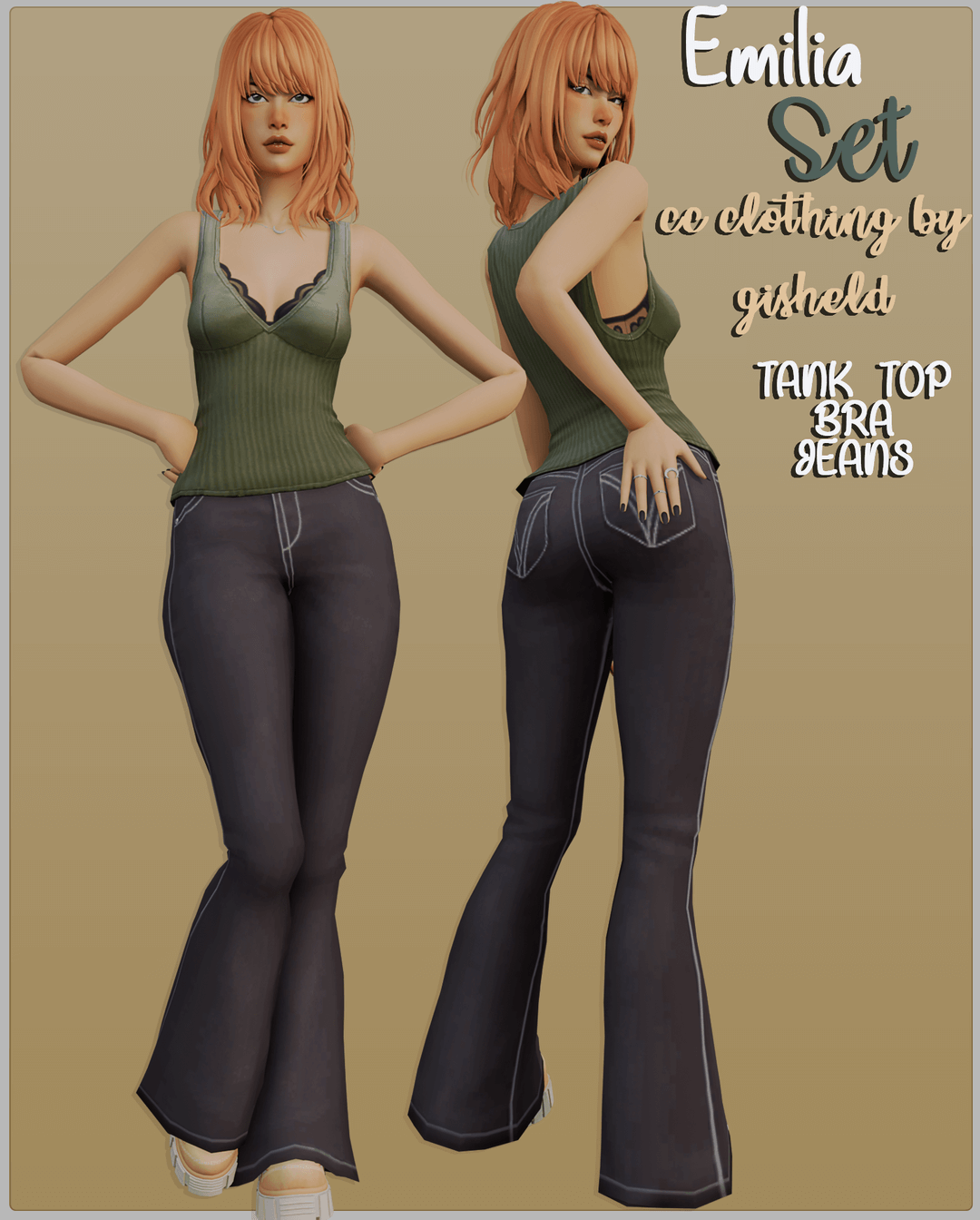 Emilia Clothing Set Hello darlings 🙂 , I’m sorry I disappeared again, I went back to study so between the tests, the interniship and life in general, finding time for CC has become difficult. But I’m almost done so hopefully I can be more present in the sims community. Anyway…. this set is a bit different from the preview I posted a while ago. I didn’t like the previous tops I made, I’ll probably get back to them later, but I have other CC I want to make.