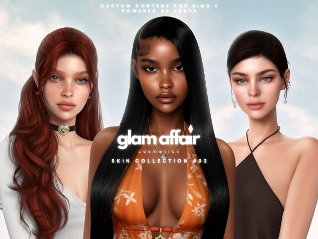 Glam Affair Skin Collection 02 Ingrid Skin & Sim 39 Swatches 13 Skin Shades & 3 Brow Options Model Sim Included with Tray Files & Mods Ingrid Skin Overlay 6 Swatches Ingrid Lipstick 7 Swatches Ingrid Eyeshadow 6 Swatches