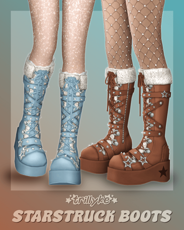 Starstruck Boots Cute platform knee high boots with a star shaped hole on the sole, star buckles, spikes and many little details all over! It was a ton of fun to make, I hope you enjoy! ⭐ (inspired by) custom thumbnail 20 swatches base game compatible edited EA mesh by me